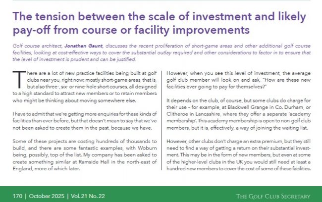 The tension between the scale of investment and likely pay-off from course or facility improvements Golf course architect, Jonathan Gaunt, discusses the recent proliferation of short-game areas and other additional golf course facilities, looking at cost-effective ways to cover the substantial outlay required and other considerations to factor in to ensure that the level of…